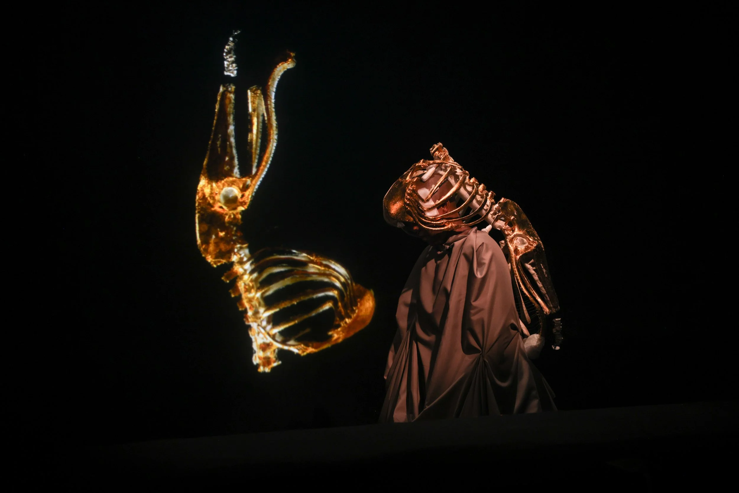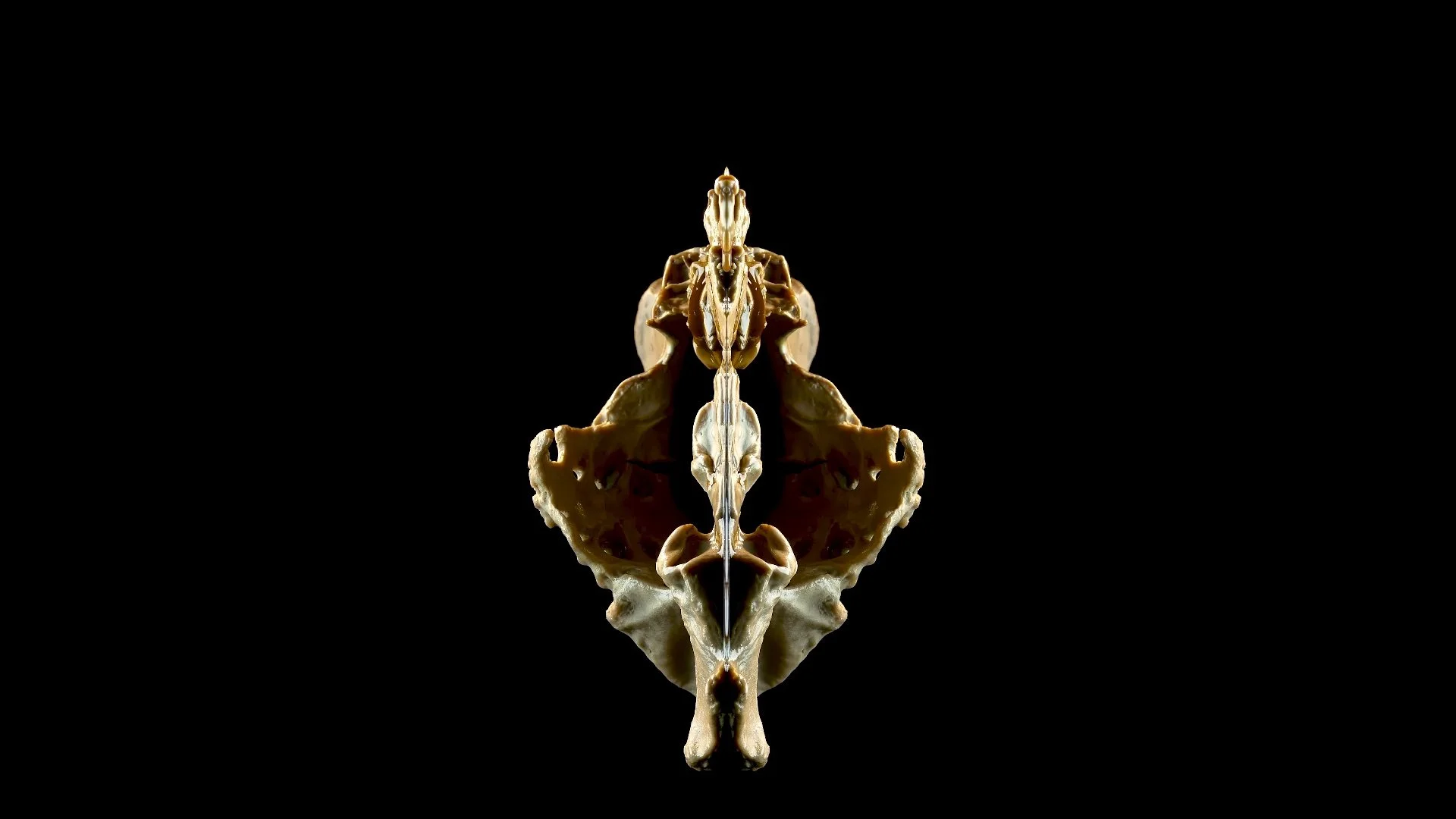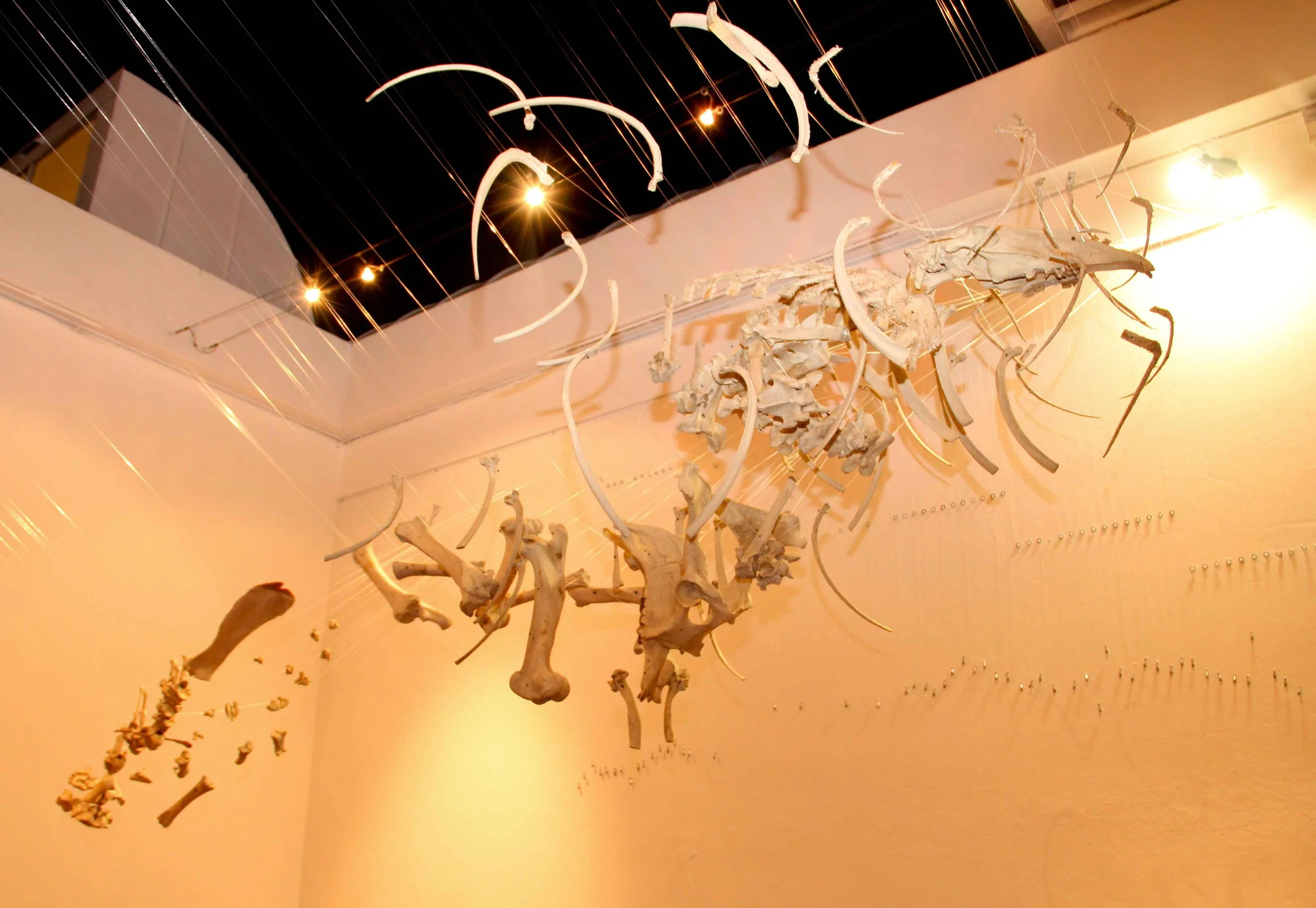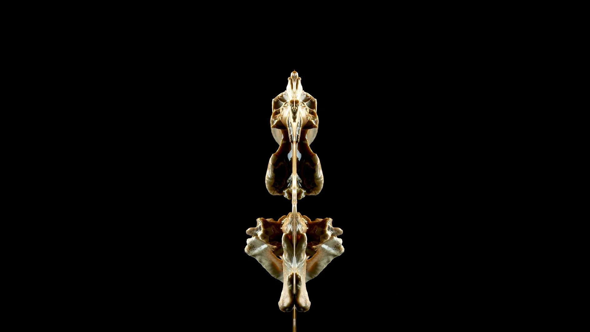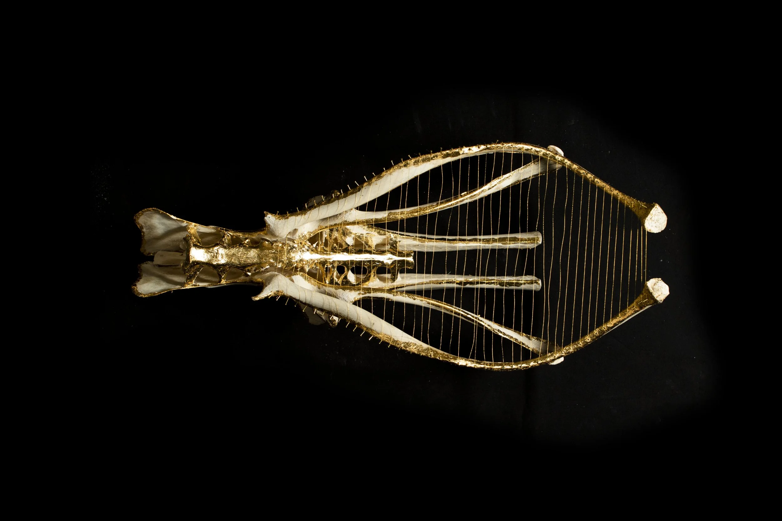 In Still Life we see Lace’s collection of bones cleaned, gilded, threaded, dutifully photographed and digitally blended into one another on a four-screen video installation. Lace’s instinct as an artist has been to use and transform the darker elements of life – death and decay, abandonment and neglect – as ingredients to foster in-between spaces or platforms portraying the significance of fragility and vulnerability. Collaboration is central to Still Life. The silent video works and installation elements find themselves in conversation with landscape music composer Anne Vanschothorst’s spoken word project klip lied snaar: voordrag van gedigte en harpmusiek, a collaborative compositional project made in response to the poetry and voice of Antjie Krog. The selected poems by Krog are ‘Still Life’, ‘Land van Genade en Verdriet’, ‘Die Ligaam Beroof’, and ‘Grond’.