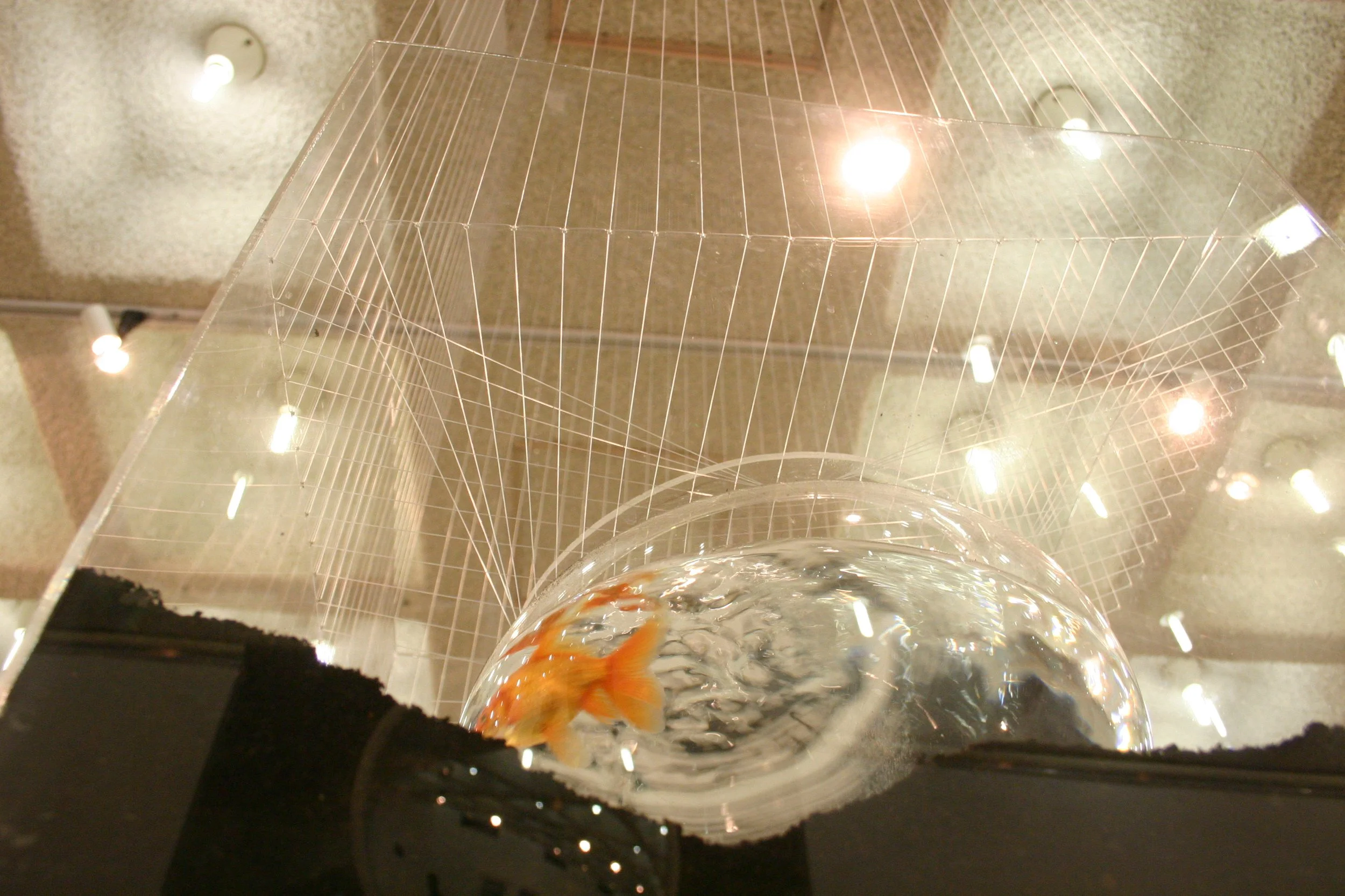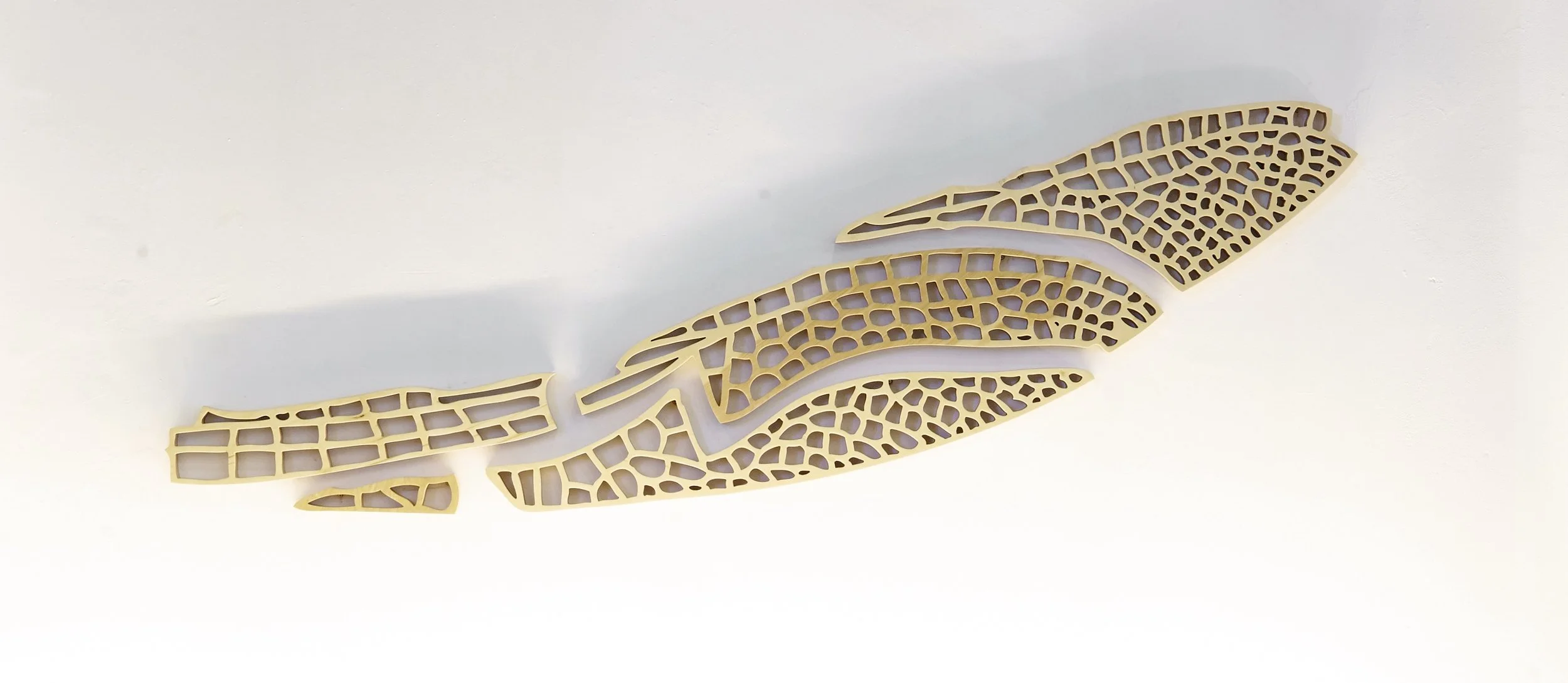 For some years now an element of my practice has involved creating site-specific installations with fishing line and suspended elements. The pieces are built in situ, with repetitive threading, line by line, between two fixed elements. Through this process I create somewhat architectural-like structures, sometimes empty and sometimes containing swarms of fishing flies, insect wings or shattered stained glass. These works only live in this form for as long as the show is open. It’s their first temporary life form. Collapsing my site-specific installations has become a ritual, a process of releasing the structure by removing the elements that hold the line in place and allowing gravity, chance and chaos to create a new form, a container is then created to hold the piece in its next life.