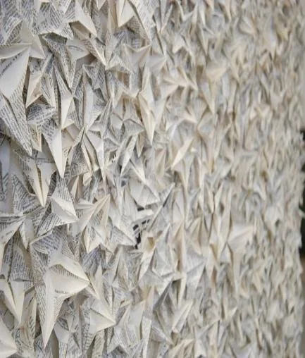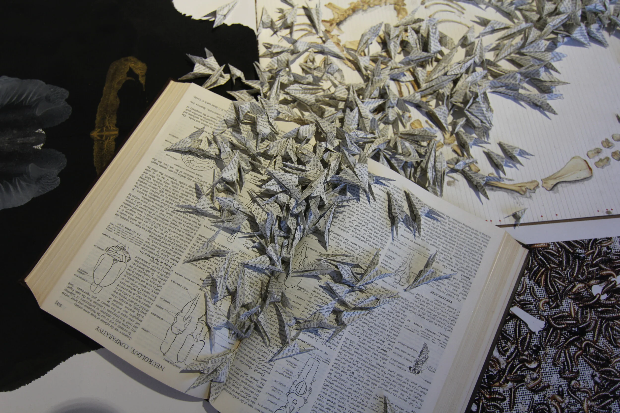 For Lace, the origami works invoke the loss associated with the technological shift from information in hard copy into digital forms that has defined our era. In tearing these pages from the Britannica, folding and stitching them, she gives them another life. The encyclopedia, and its words will remain physically present – potentially for a long time to come.